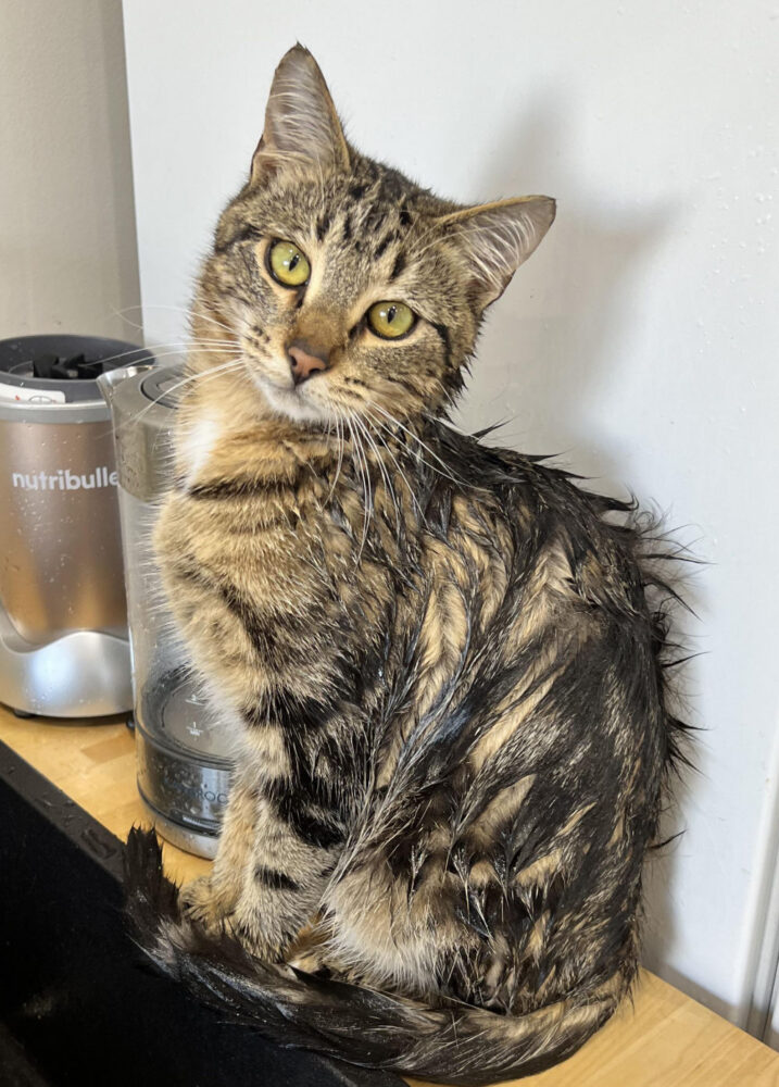 In one of the cat photos she provided, the cat was already wet, and although it’s head was not in the perfect position, I really wanted to take advantage of that wet fur! So I adjusted the angle of the head, then I used the small patch of wet fur on the right side of the image as a template to create similar wet fur around the whole face, for a “fresh-out of the shower” look. Because the original cat photo was not in a front facing pose, I had to use AI to generate the front paws, but I think it did a decent job, what do you think?