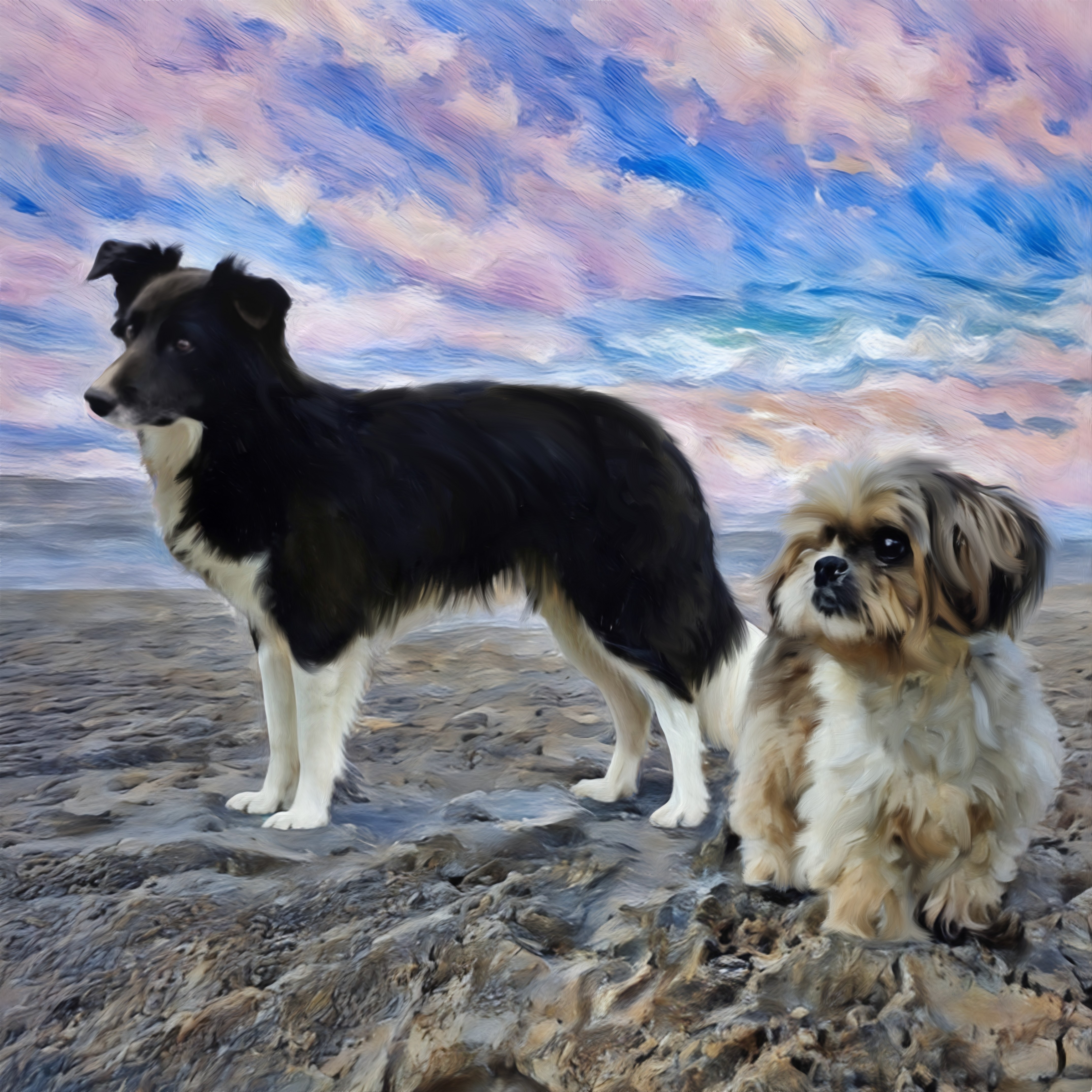 The images provided were not the best quality, particularly the black and white dog, but I did the best I could with them, with a bit of help from AI to realign the legs. But of course, I am like a hammer with a nail… I always think these images look better as paintings! LOL