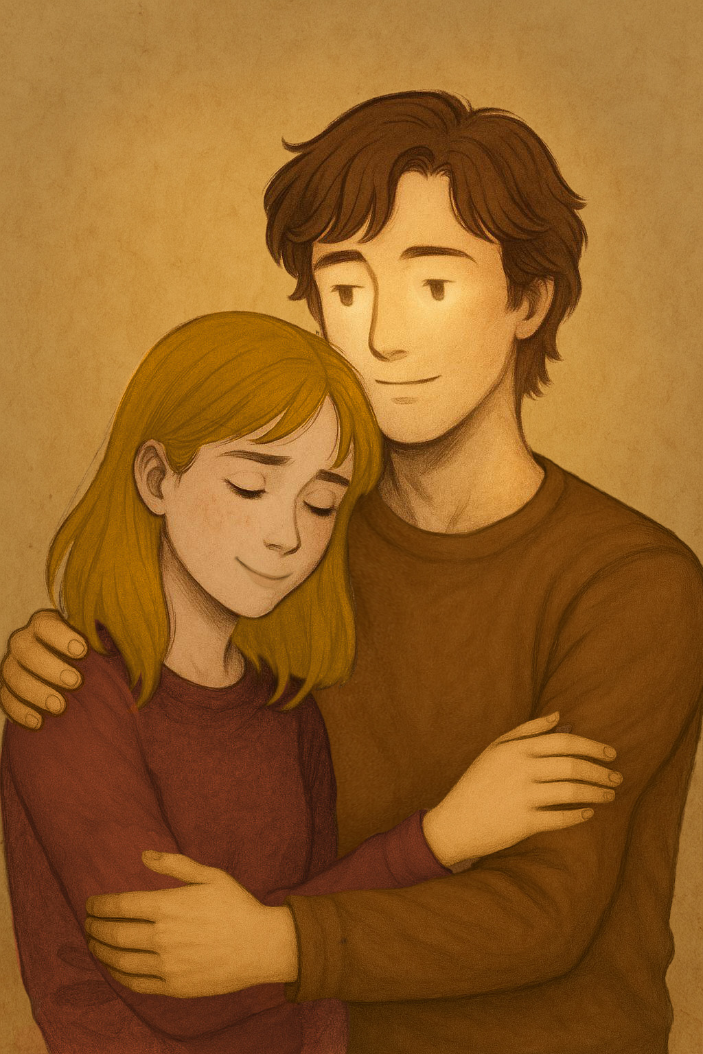 Is anyone able to give the girl blond hair and a soft smile. Can you give the boy his other eye. And if possible put both arms around the girl?