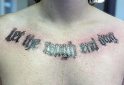 Not really photoshoppy, but for those who like a challenge: Super Super SUPER longshot. Having a super hard time finding this font, but im looking to get a tattoo in this font style from my favourite band but having a hard time finding the creator for design, or one similar to this. I need a picture that says “Let The Rough End Drag” in this font. Its from one of their songs, and has a pretty heavy meaning to me. Thanks!