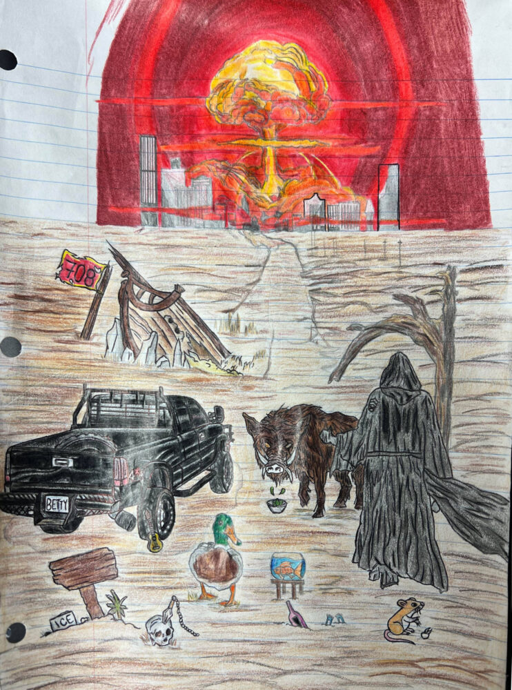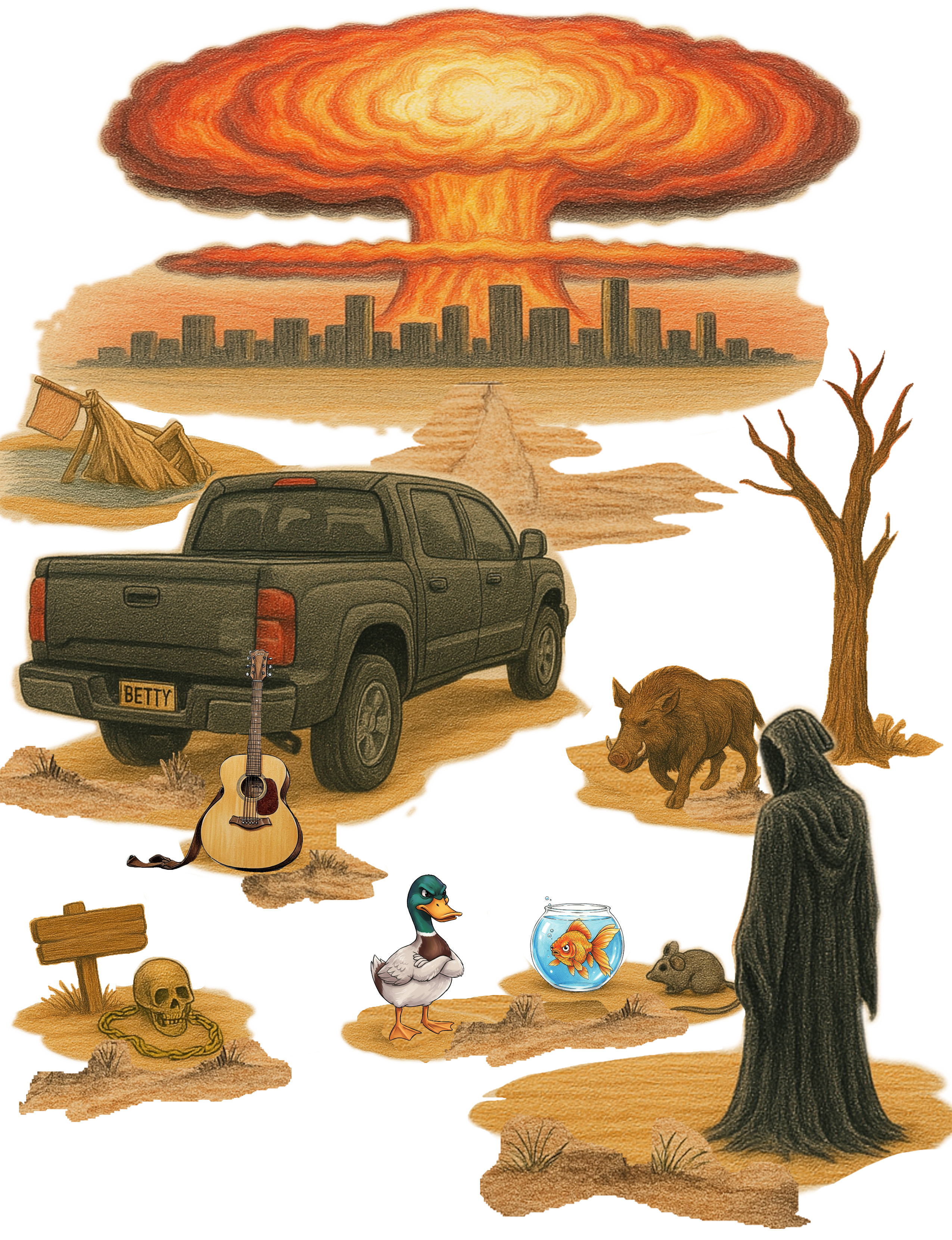 I never actually complete this edit, because OP chose another editor before I finished. But I thought it was a really neat image, so I kept it anyway. There are a few elements in the image (duck, fish, guitar) that are not yet transformed into the grainy illustration style that I chose to work with. It is one of my favorites, what ChatGPT considers a “colored pencil sketch”, which I thought would be appropriate since the original image was also colored pencil. I also had not added any of the text yet. As, requested, I kept each section on it’s own little island of sand so that there would be no defined outline to the image when printed on a shirt, though I am not sure how I feel about that, LOL.