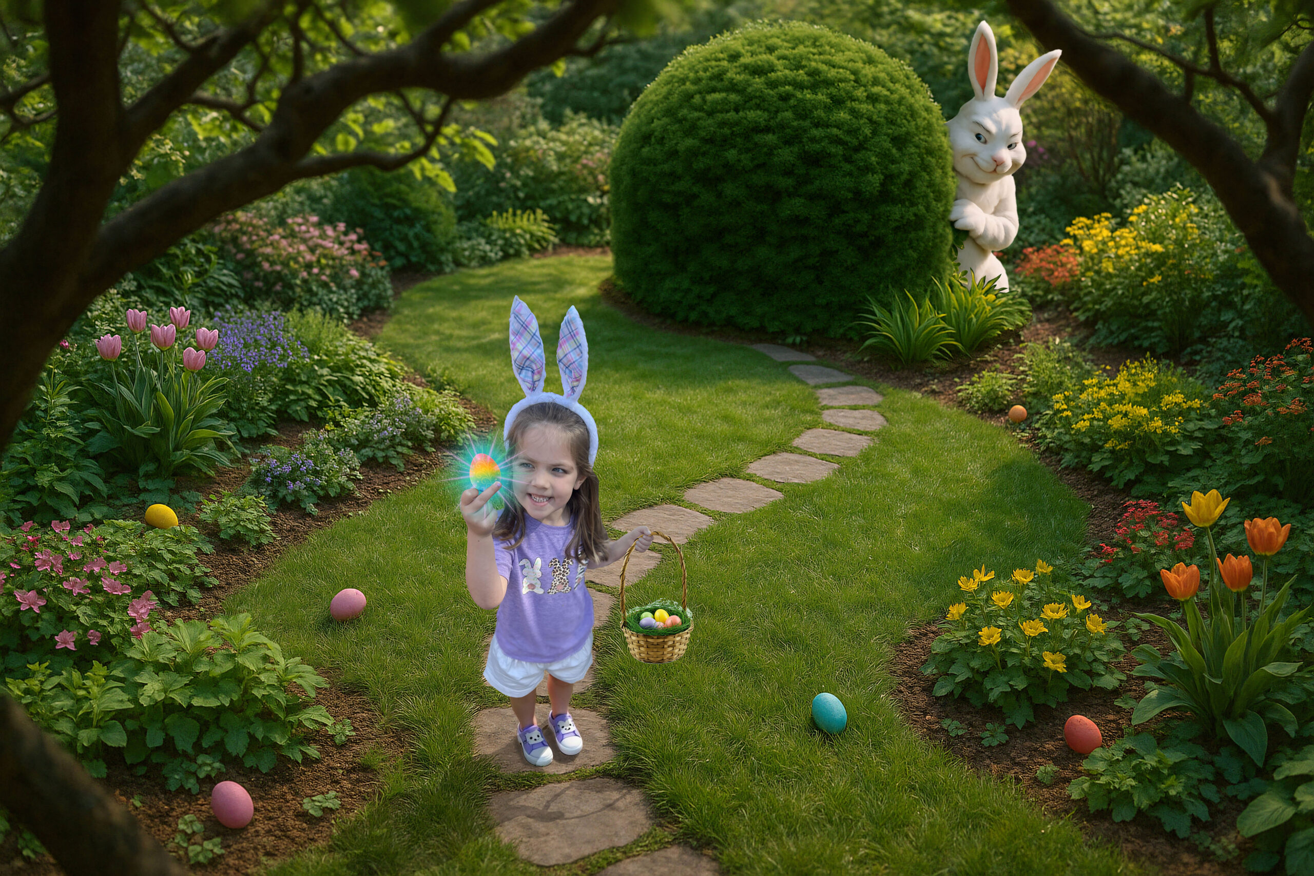 This edit was a ton of fun and a real challenge to my editing skills! The odd perspective, looking down onto the little girl made it impossible to place her in any flat landscape with even a semblance of realism. The Easter Bunny part was not too hard, he’s an iconic figure and AI generators had no trouble giving me a number of great options to choose from, but getting it to understand I wanted to be looking down onto the landscape from above, but not directly above, was another story! I finally got it to understand when I said I wanted the photo to be taken from the perspective of a bird up in a tree branch.