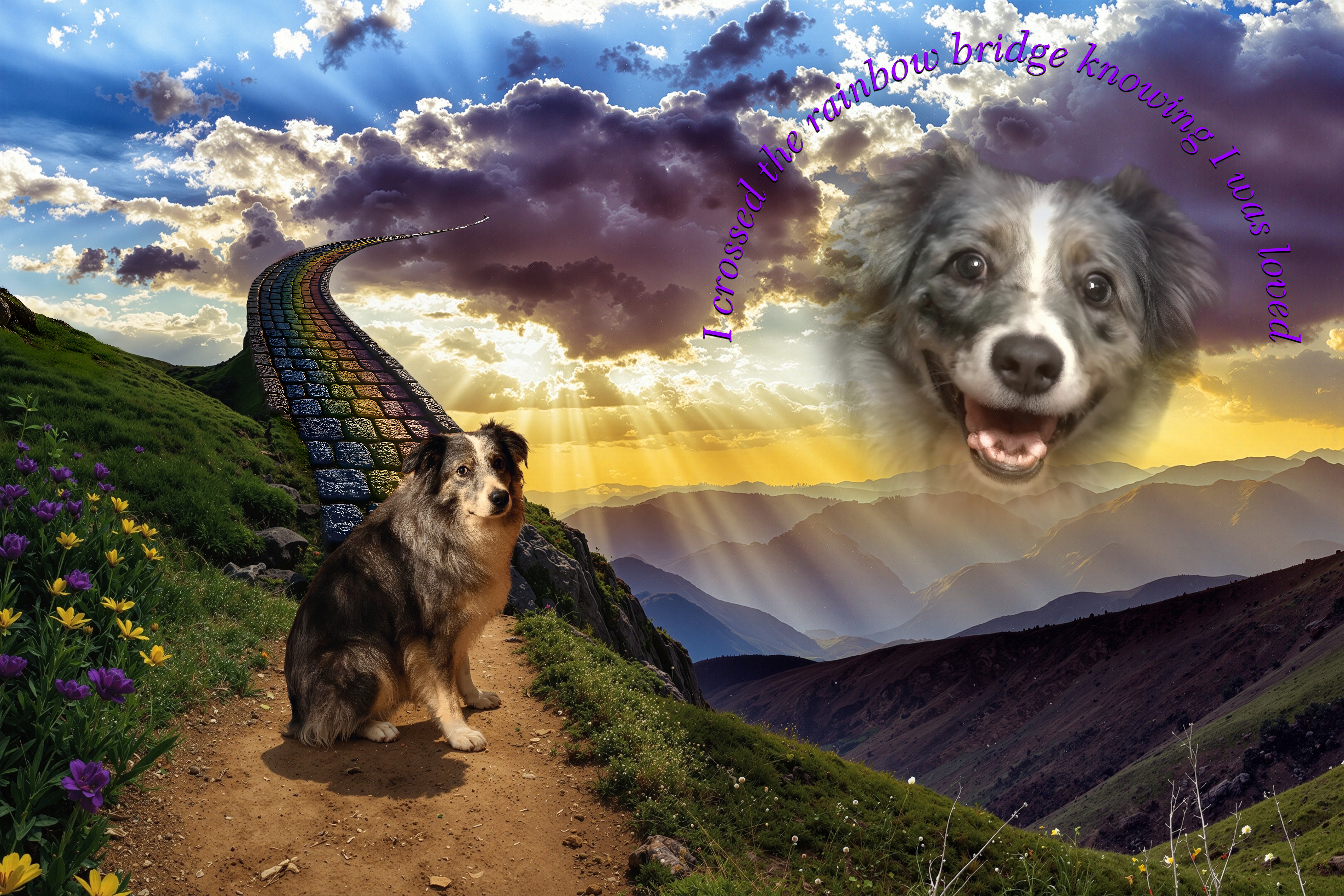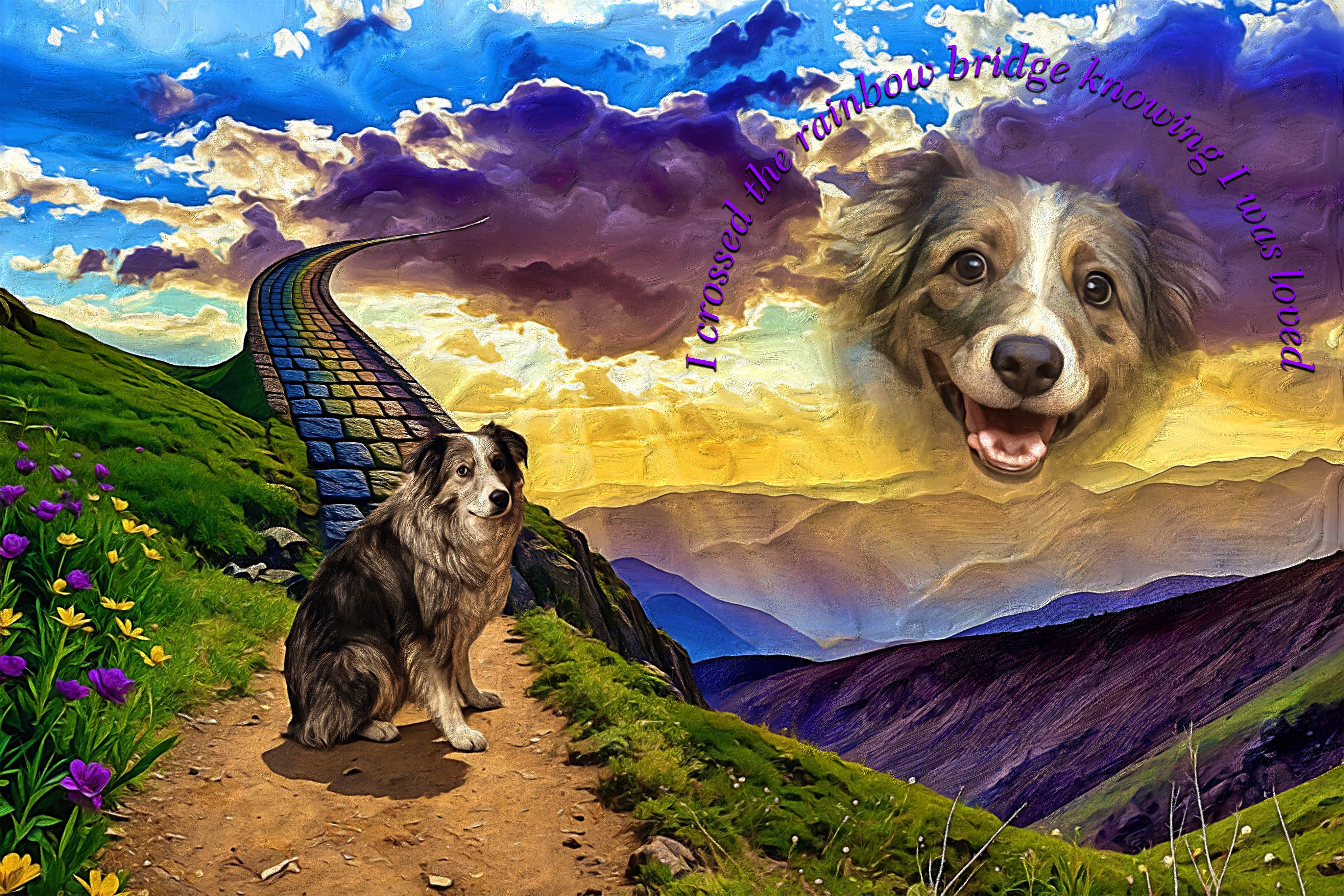 My mother in law’s soul dog was put to sleep this week. I have been trying with AI for DAYS to create a photo of the dog walking across a rainbow bridge I can give to her. I’ve gotten versions of different breeds of dogs, dogs missing legs, random humans for some reason, cartoon dogs, etc and I’m at my wits end. Can someone help me? Attaching pics of the dog and some of the failed attempts of what I’m looking for.